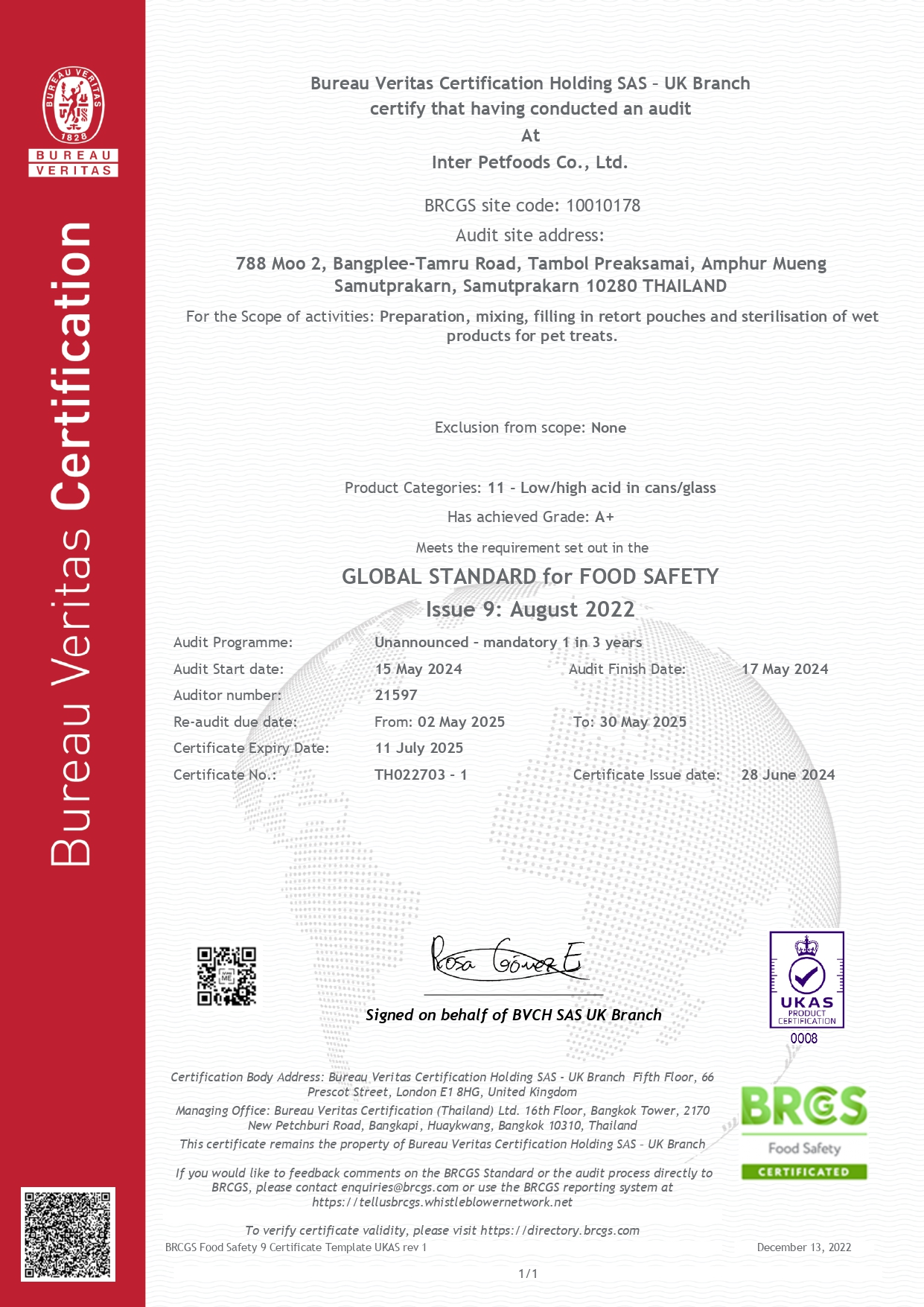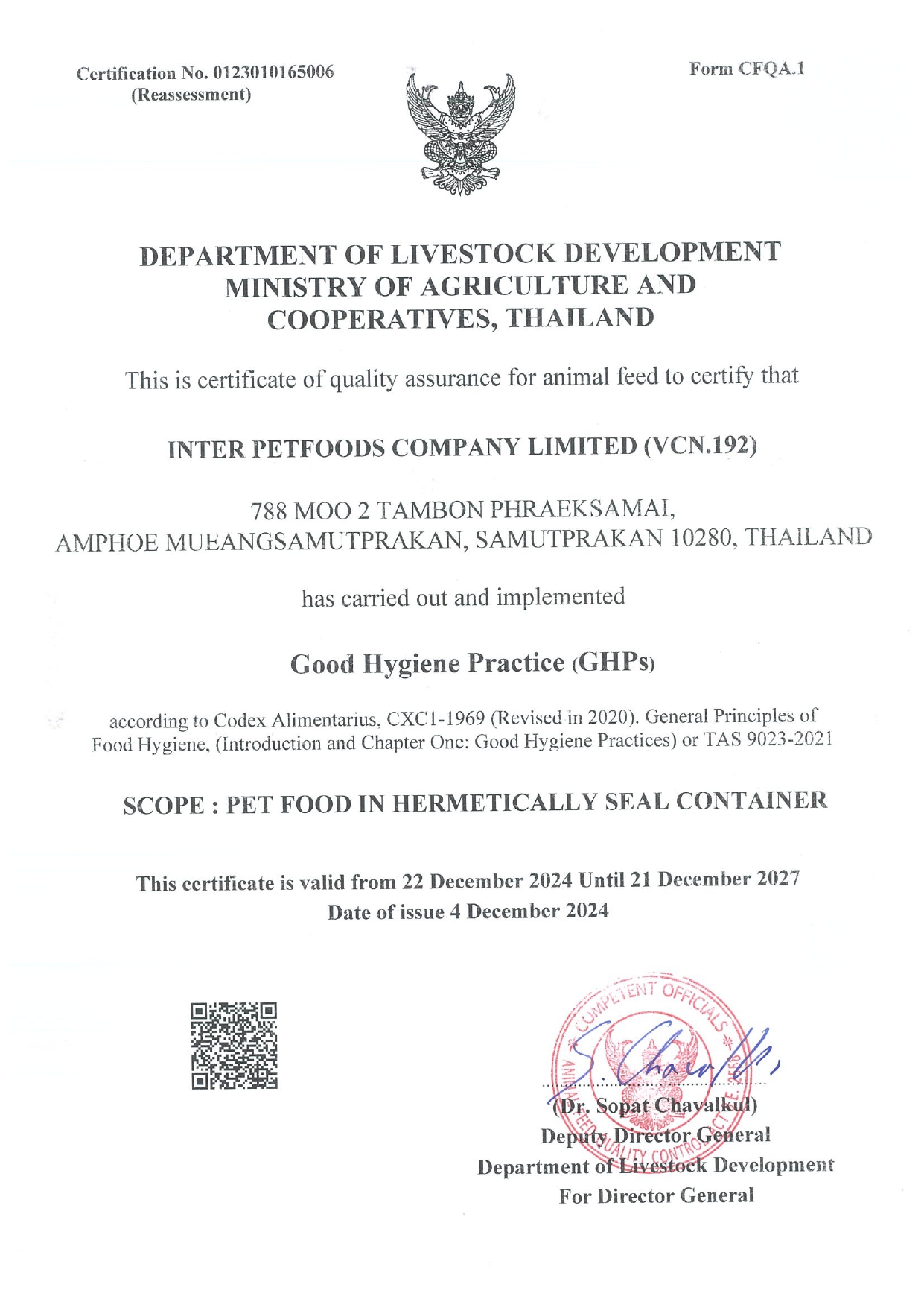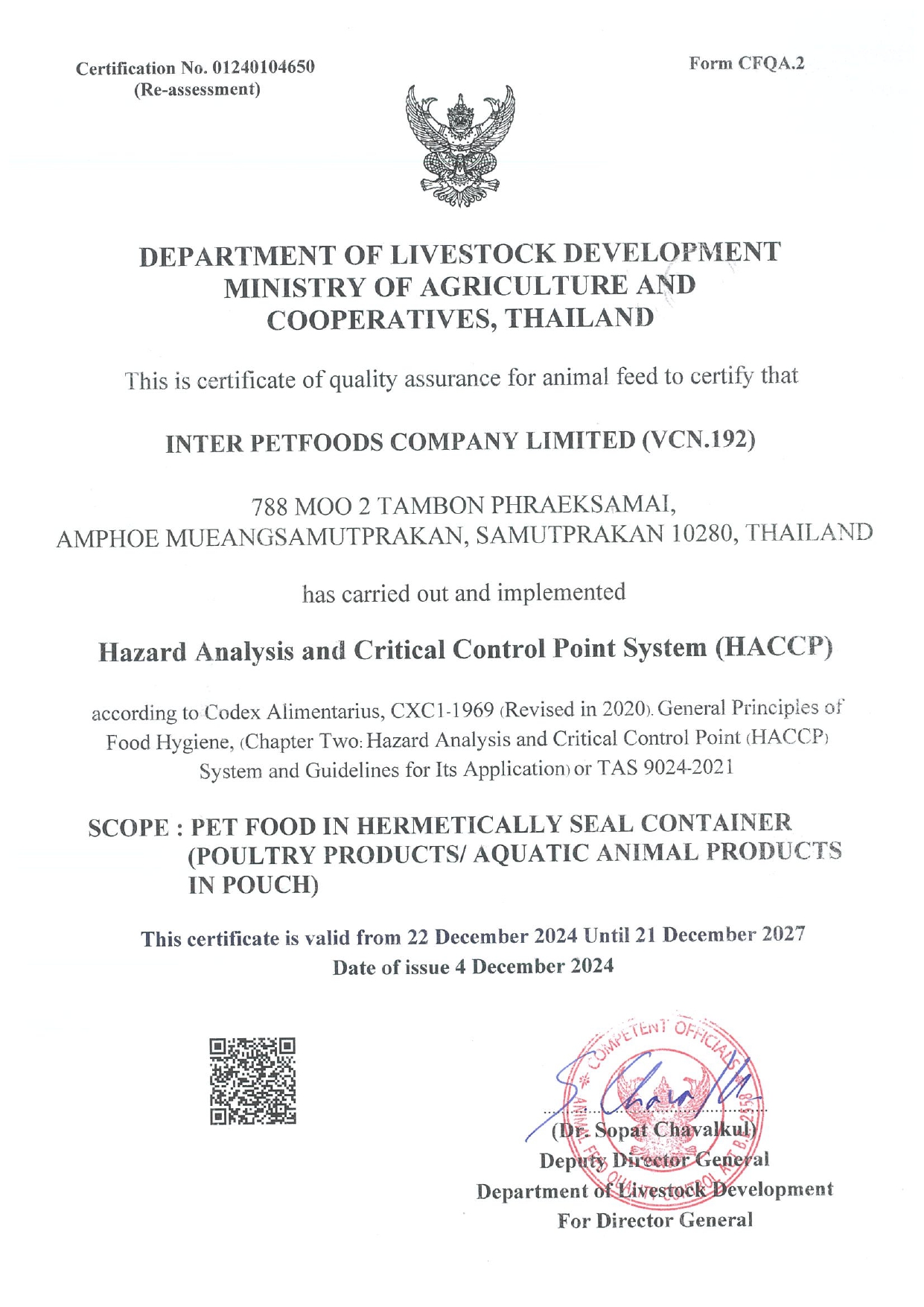 Inter Petfoods co. Ltd. was established in 2020 with a capital of 90,000,000 Baht. Our company specializes in manufacturing retort products such as lickable sachet treats for dogs and cats. We have obtained the Government Export Establishment Certificate (VCN.192), HACCP, GMP, and BRC certifications, which are the highest standards in the manufacturing industry.